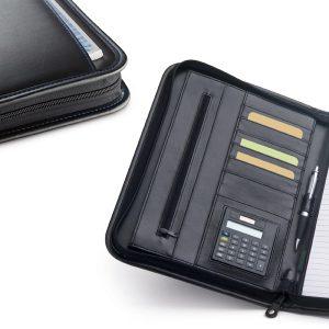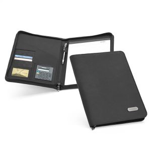 Pasta A4. Microfibra. Calculadora dual-power de 8 dígitos. Incluso pilha LR1130. Bloco: 20 folhas pautadas. Esferográfica não inclusa. 245 x 325 x 40 mm | Chapa: 45 x 15 mm