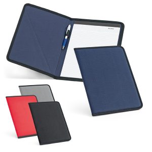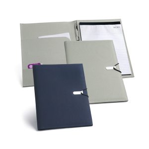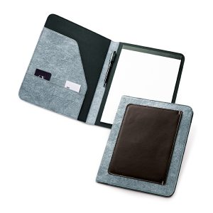 Pasta A4. Feltro e c. sintético. Com bolso exterior. Bloco: 20 folhas não pautadas. Esferográfica não inclusa. 250 x 312 x 15 mm | Bolso: 186 x 254 mm