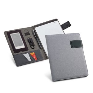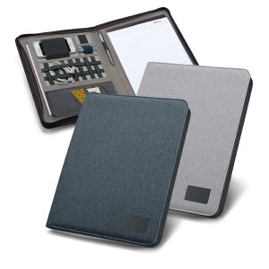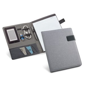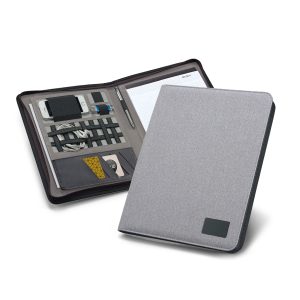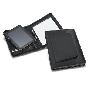 Pasta A4. C. sintético e microfibra. Bolso exterior com zipper. Interior com suporte para tablet (10.1” e 7”). Bloco: 20 folhas pautadas. Esferográfica e pen drive não inclusas. 255 x 350 x 30 mm