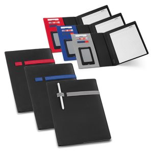 Pasta A4. C. sintético e 800D poliéster. Interior em microfibra. Bloco: 20 folhas pautadas. Esferográfica não inclusa. 245 x 315 x 15 mm
