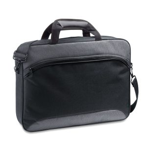 Pasta para notebook. 600D2Tone e 300D. Compartimento para notebook 14”. Interior forrado e almofadado. Alça de ombro e alça para transporte em trolley. 400 x 300 x 80 mm